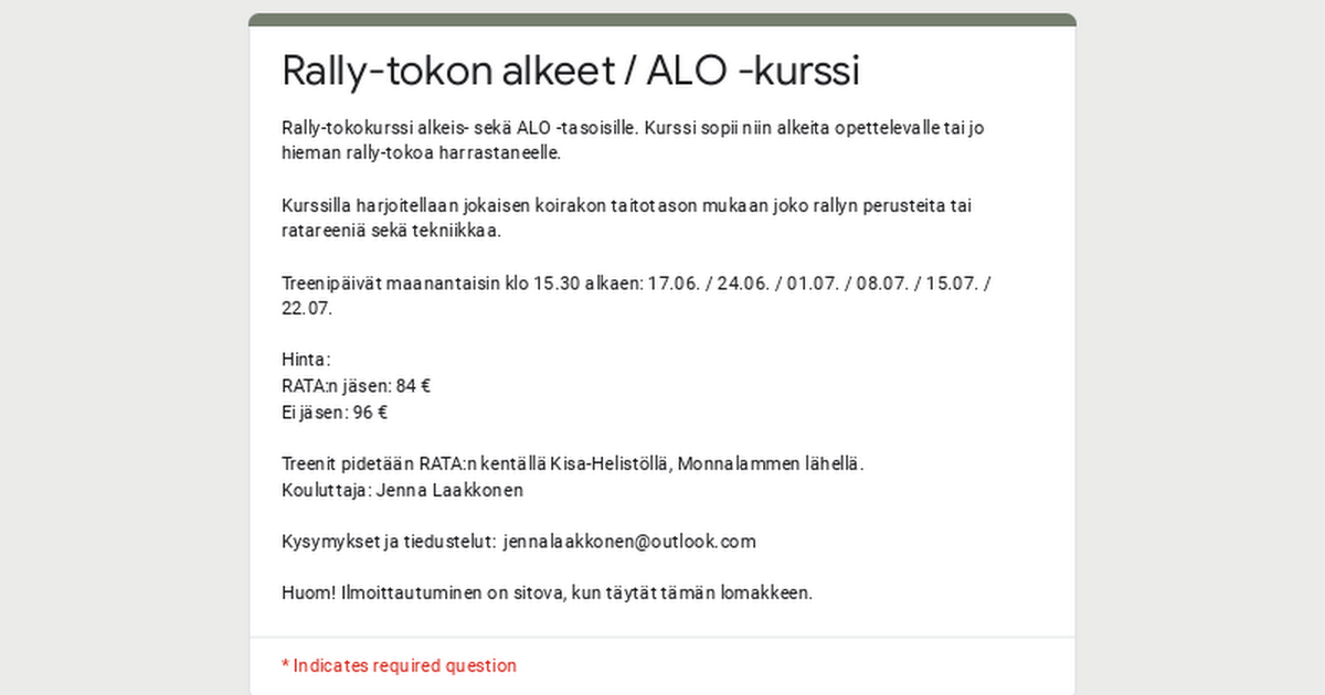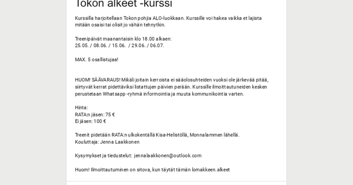 Rally-tokokurssi alkeis- sekä ALO -tasoisille. Kurssi sopii niin alkeita opettelevalle tai jo hieman rally-tokoa harrastaneelle. Kurssilla harjoitellaan jokaisen koirakon taitotason mukaan joko rallyn perusteita tai ratareeniä sekä tekniikkaa. Treenipäivät maanantaisin klo 15.30 alkaen: 17.06 /...