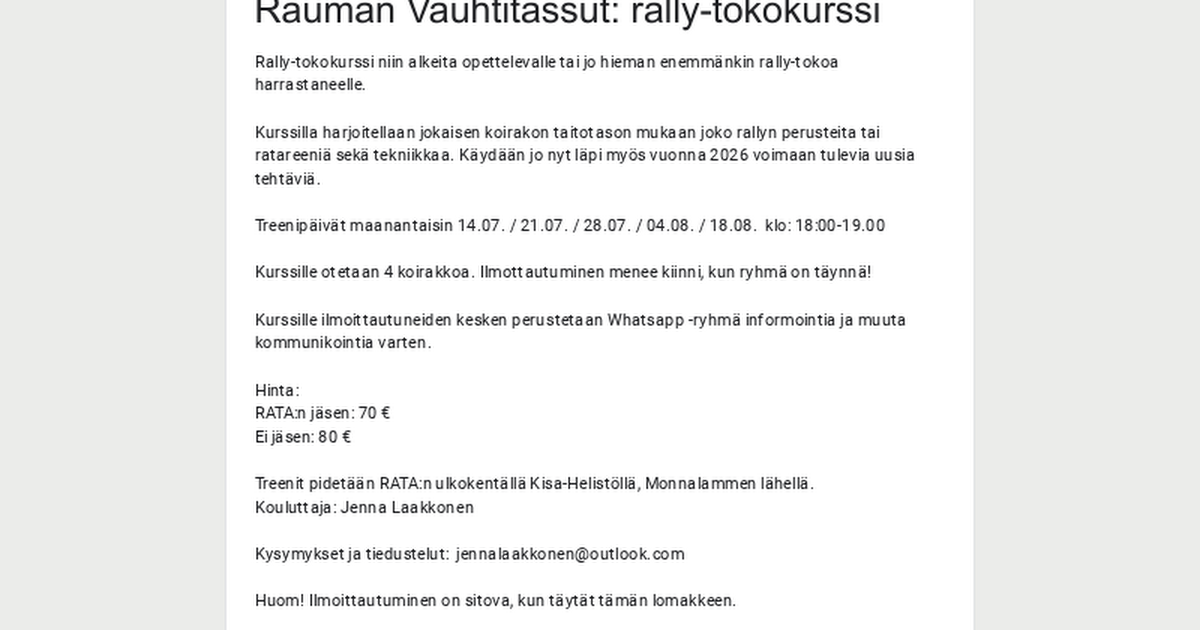 Kurssit palailevat tauolta ja vuorossa on jatkoa rally-tokoon - tervetuloa niin uudet kuin vanhat kurssilaiset! 🤩🥳 Kurssit alkavat jo vähän reilu viikon päästä 😊 Maanantaille